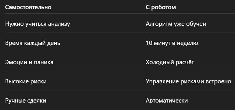 Вы устали от гонки? Постоянная нехватка времени и вечное «завтра начну заниматься финансами»? Представьте себе: всего 10 минут в день — и ваши деньги уже работают на вас. Без контроля графиков, без новостных лент и стресса. Добро пожаловать в мир автоматизированной торговли. Для начала разберёмся, что такое торговый робот. Это не магия и не «кнопка бабло». Это алгоритм, который автоматически анализирует рынок и совершает сделки по заданной стратегии. Его задача — не угадать рынок, а системно работать с рисками и возможностями, пока вы занимаетесь своей жизнью. Главная ценность — экономия времени. Робот не спит, не устает, не сомневается. Он делает то, что запрограммировано, и делает это каждый день — стабильно. Потому что: Это идеальное решение для: Возьмём условный старт — 10 000 рублей. По консервативной стратегии робот может давать около 6–8% в месяц. Пусть будет 7% — средний вариант. И это без дополнительных пополнений и при работе в автоматическом режиме. Реальный эффект даёт слож