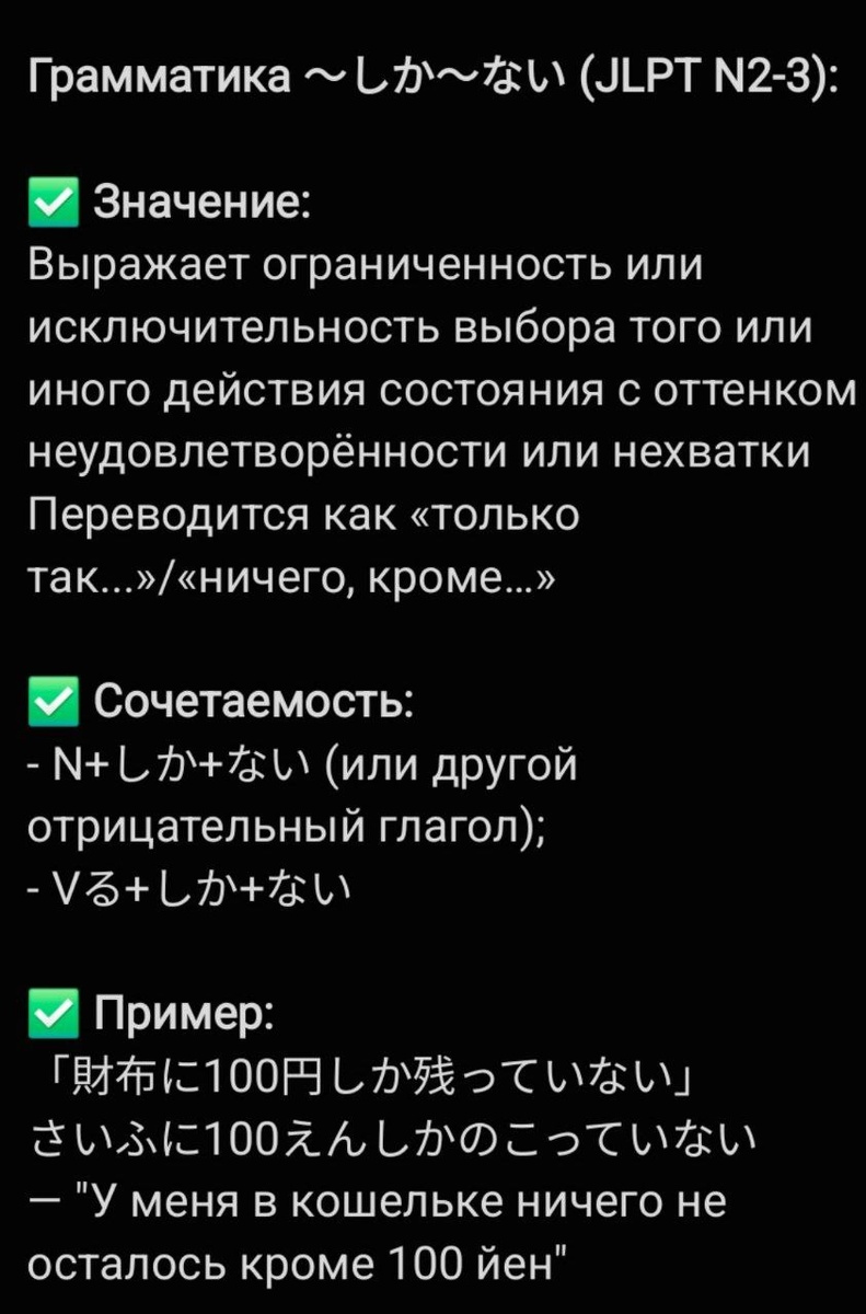 Грамматика ~しか~ない (JLPT N3-2): ✅ Значение: Выражает ограниченность или исключительность выбора того или иного действия состояния с оттенком неудовлетворённости или нехватки. Переводится как «только так...»/«ничего, кроме…» ✅ Сочетаемость: - Существительное + しか + ない (или другой отрицательный глагол): Пример: 時間しかない → «Есть только время (и больше ничего)»; - Глагол в словарной форме + しか + ない: Пример: 頑張るしかない → «Остаётся только стараться» (другого выбора нет) ✅ Пример: 「財布に100円しか残っていない」 さいふに100えんしかのこっていない — "У меня в кошельке ничего не осталось кроме 100 йен" #грамматика #JLPT_N3_2