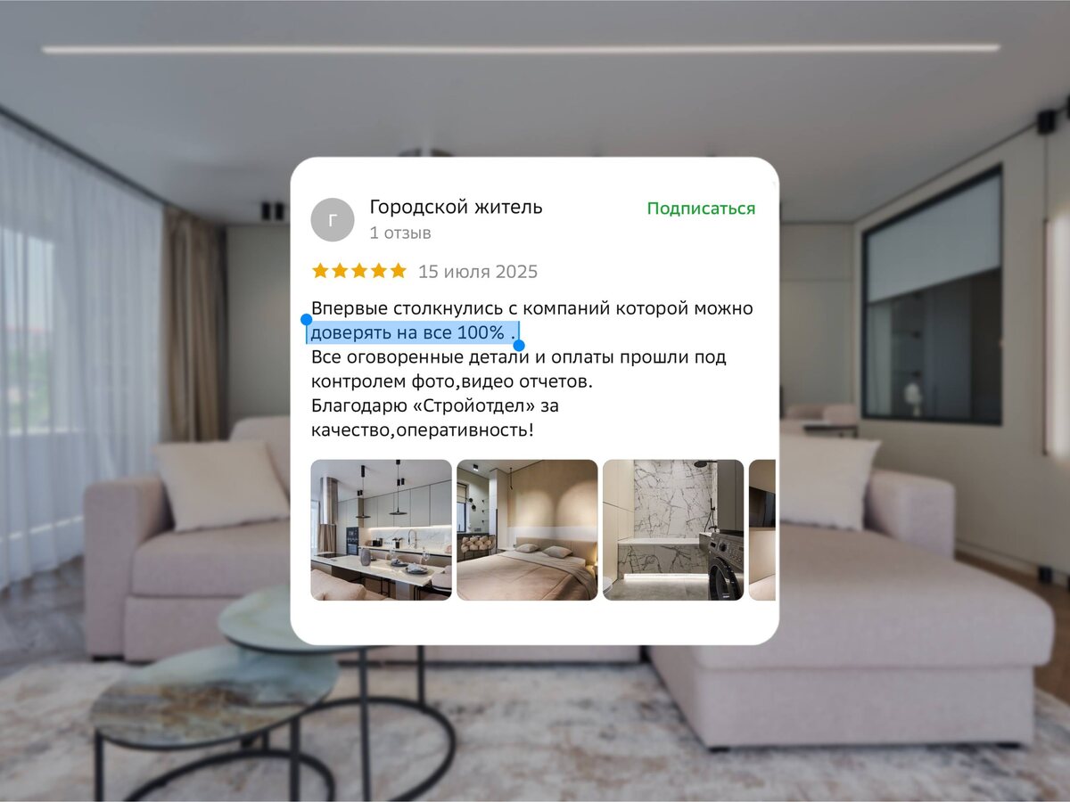 Впервые столкнулись с компанией, которой можно доверять на все 100% Такие слова от клиентов бесценны. 📌Всё, что пообещали — выполнили без задержек и «сюрпризов» 📌Смета прозрачная, без скрытых пунктов. Каждый этап — под контролем, с фото и видео. 📌Финальный штрих — уютный интерьер, в который заказчики въезжают с радостью. 🏘Речь о квартире в ЖК «Бочаров Маяк», с которой вы уже знакомы: — с чего все начиналось — тот самый эффект «вау» — самая продуманная зона — самый сложный этап Это как раз тот случай, когда доверие = результат продуманной, честной работы всей команды. Спасибо нашим заказчикам за доверие 🙌 #Отзыв