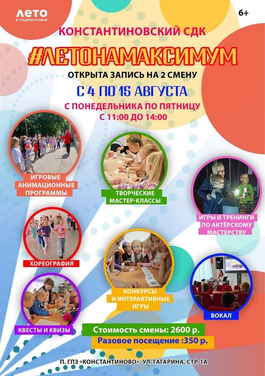 ✨ 🔥 #ЛЕТОНАМАКСИМУМ: взрыв эмоций для вашего ребенка! 🔥 С 4 по 15 августа (пн-пт, 11:00-14:00) в Константиновском СДК – невероятная летняя смена для детей! Чем займемся? 🎨 Творческие мастер-классы 🕵️♂️ Увлекательные квесты и викторины 💃 Мини-дискотеки 🎭 Актёрские тренинги и игры 🎬 Кинопоказы ⚽️ Спортивные активности 🏆 Конкурсы и море интерактива 💰 Стоимость: ✔️ Полная смена – 2600 руб. ✔️ Разовое посещение – 350 руб. 🚫 Возраст: 6+ 🏢 Константиновский сельский дом культуры (СДК) 📍 г.о.Домодедово, пос.Государственного племенного завода Константиново, ул.Гагарина, д.1А ✅ Мероприятия Домодедово https://dzen.ru/id/66f10385cc4c5a16f7b5fb02 http://vk.com/domodedovo_events http://dzen.ru/domodedovo_events