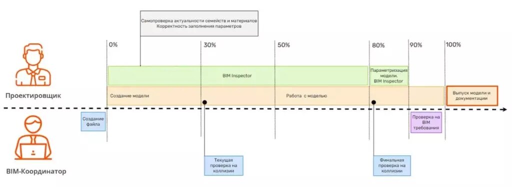 Структура команды В компании — 2500 проектировщиков, от них ежемесячно поступает примерно 1800 заявок по моделям, которые распределяются между BIM-координаторами. Каждый ведёт несколько объектов: администрирует, координирует и согласует модели, проверяет их на коллизии, контролирует на соответствие BIM‑стандартам, а также оказывает поддержку проектировщикам. Запросы проектировщиков из Revit и с портала «падают» в Jira Service Desk, где автоматически распределяются между BIM‑координаторами с выставлением приоритета в зависимости от критичности проблемы: блокирующий (ответ до 4 часов), высокий (до 8 часов), нормальный (до 16 часов), низкий (до 24 часов). Схема взаимодействия проектировщика и BIM-координатора в ПИКе — на визуале к посту. 1️⃣ BIM-координатор по заявке проектировщика создаёт файл будущей модели. 2️⃣ Проектировщик наполняет созданную модель и регулярно проводит самопроверку через BIM Inspector, чтобы своевременно выявлять простые ошибки. BIM Inspector — комплекс инструментов