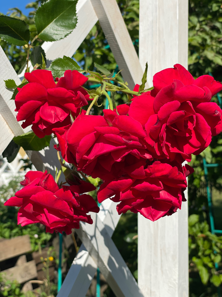 Идея посадить на участке плетистые розы пришла ко мне около четырёх лет назад. Всё началось с размышлений: чем бы замаскировать неказистую стройку, замершую на участке без движения и без надежды. Хотелось превратить этот уголок из грустной сцены недостроя в живую картину. Розы показались идеальным решением — их цветение притягивает взгляд, отвлекает от несовершенств, дарит ощущение уюта и красоты. Но любая плетистая роза нуждается в достойной опоре — ведь она не просто цветок, а актриса сцены, которой нужна сцена, на которую она сможет взойти. Так на участке появилась пергола с качелями в прошлом году, а в этом — ещё две опоры. Вдохновение, конечно же, черпала на Pinterest. Где же ещё мы ищем садовые мечты? Вокруг перголы поселились красные плетистые красавицы. С одной стороны — «Симпатия», с другой — «Амадеус». А сзади, чуть в тени, гордо расцветает «Флорентина». Отдельная опора, видимая с террасы, установлена специально для «Симпатии» — моей первой плетистой любви. Я посадила её ещё