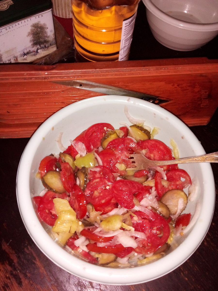А вот что тут напишешь? Всё ясно - овощи на постном масле. Вместо соли - солёные огурцы и немного рассола. Для приготовления салата пользуюсь овощерезкой - быстро и удобно. Огурцы солили с Котстантином, но шерсти в них нет. Вообще, животным не место на кухне во время стряпанья. Но Котстантина трудно выставить оттуда. Запираюсь, а он ломится - думает, я там поедаю курицу.