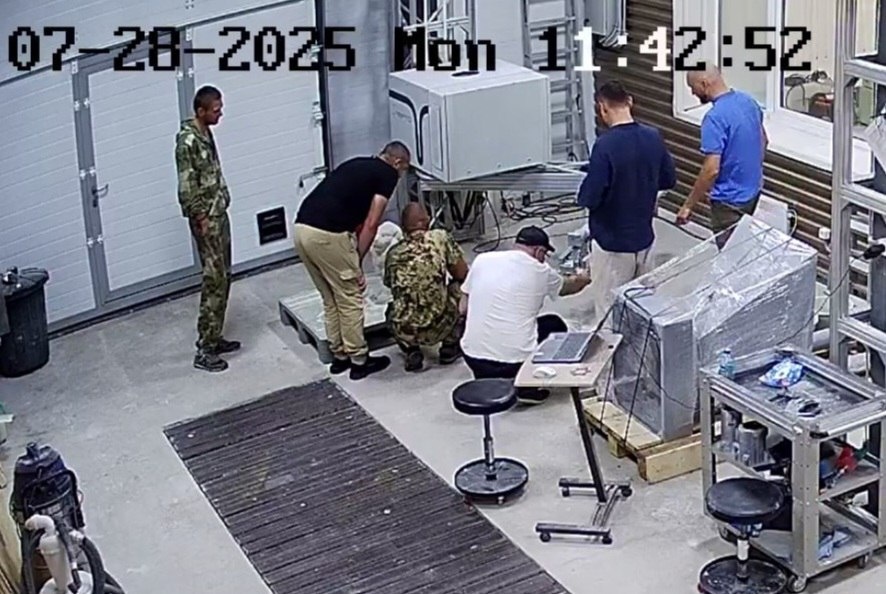Скриншот с видеокамер Лерто сегодня. Рассказываем что тут происходит. Сегодня нас посетила делегация, которая приехала смотреть Лерто принтер перед покупкой. Принтер, который вы видите, сейчас уже демонтируется и упаковывается для отправки заказчику, который оплатил его в июне. Хотелось бы сократить сроки поставки, а в идеале продавать из наличия, но на данный момент спрос на Лерто принтеры выше, чем производственные возможности. Стараемся наращивать темпы производства. Для демонстрации печати теперь в нашем цеху у нас не осталось ни одного принтера, но в августе мы ждём комплектующие для сборки следующих Лерто принтеров. По приезду делегации, мы при них поставили печать бетонного льва. Пока шли переговоры, Лерто принтер напечатал льва без участия человека, после принтер промылся. И всё это происходило на глазах наших гостей. Таким образом, они увидели полный цикл печати готового изделия от замеса бетона до промывки. Увиденное им понравилось. Запросили договор на поставку Лерто принт