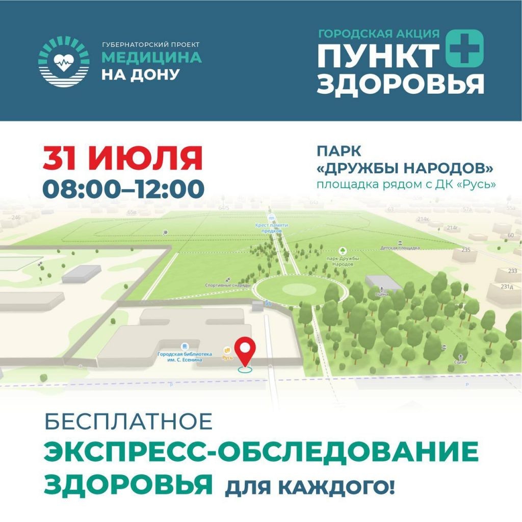 31 июля (четверг) С 8:00 до 12:00 Парк «Дружбы народов» (площадка у ДК «Русь») Дорогие батайчане! Приглашаем пройти бесплатное экспресс-обследование в рамках губернаторского проекта «Медицина на Дону». Что предлагается: – Измерение артериального давления, роста, веса и ИМТ – Определение уровня насыщения крови кислородом – Анализ уровня глюкозы и холестерина – Проведение электрокардиографии – Консультации терапевта и эндокринолога Условия участия: – Обязательно иметь при себе паспорт – Проходить обследование натощак – Мероприятие проводится только в хорошую погоду Все процедуры абсолютно бесплатны и не требуют предварительной записи. Обследование занимает 15-20 минут, но может помочь вовремя выявить проблемы со здоровьем и начать необходимое лечение.