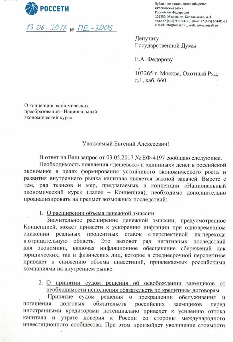 В 2017 году депутат Евгений Алексеевич Федоров обратился в ряд российских компаний, в том числе и в «Россети», с предложениями по рассмотрению идей Национального Экономического Курса (НЭК) и укреплению финансового суверенитета: увеличение рублёвого финансирования, снижение зависимости от иностранных кредитов и пересмотр долговой политики.
