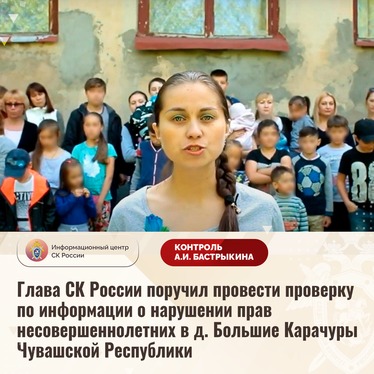Глава СК России поручил провести проверку по информации о нарушении прав несовершеннолетних в д. Большие Карачуры Чувашской Республики В социальной сети размещено видеообращение жителей деревни Большие Карачуры Чувашской Республики по вопросу нарушения прав их детей в сфере образования. В 2002 году бревенчатое здание единственной в деревне школы в связи со значительным физическим износом и повреждением конструкций было признано аварийным, а в 2022 году снесено. При этом начатое в 2003 году строительство нового образовательного учреждения до настоящего времени не завершено. В связи с этим более 20 лет несовершеннолетние вынуждены посещать учебные заведения, расположенные на значительном расстоянии от их места жительства в других населенных пунктах. Многочисленные обращения в компетентные органы результатов не принесли. Ситуация освещалась в СМИ. Председатель Следственного комитета Российской Федерации Александр Иванович Бастрыкин поручил руководителю СУ СК России по Чувашской Республике