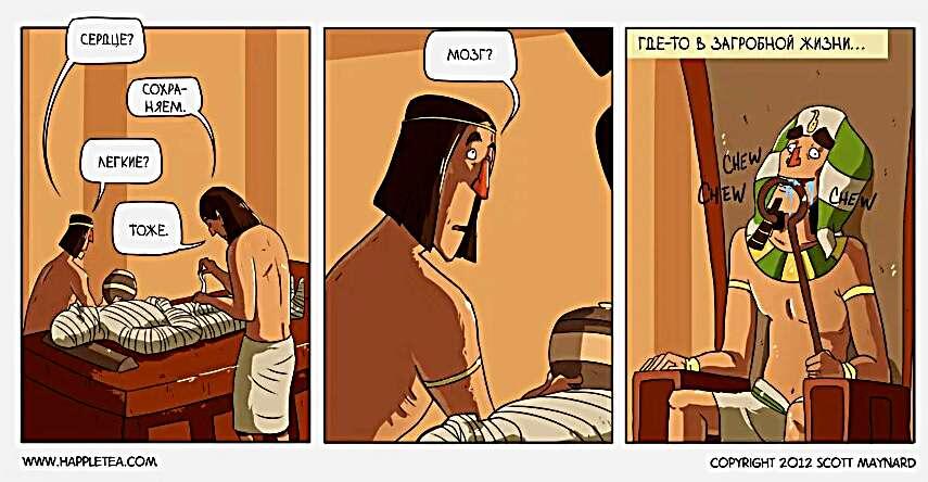Персонажи ужастиков всегда становятся темой для шуток в карикатурах. Народные легенды об оживших мертвецах, оборотнях, вампирах, привлекают зрителей в кино, а читателей в миры комиксов. Потому что это страшно смешно. Точнее даже так. Всякие пугалки - это необычно, а мистические сюжеты про всякую паронормальщину всегда интересно глянуть на фоне бытовушных историй. И, раз уж сейчас лето, жаркие деньки, решила подготовить для вас материал про мумий. Вас ждут 15 забавных историй от разных авторов. приятного чтения) Первый комикс расскажет вам коротко откуда берутся мумии. Вот умер фараон, бальзамировщики его тело обработали маслами, перебинтовали местами, чтобы сохранился на века, и в загробной жизни продолжил правление. А внутренние органы, если что, вынимаются и помещаются в специальные сосуды в гробнице. Согласно народным преданиям, мумии способны ожить и наложить проклятия на любого, кто вломится в усыпальницу и прервёт их мирный сон. Сразу несколько комиксистов поразмышляли, как это м