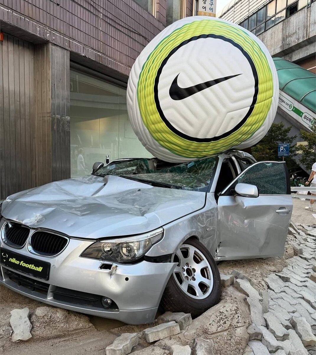 В ответ на пост «Огромный футбольный мяч целиком раздавил автомобиль». Это мог быть кликбейтный заголовок новости. Но это партизанская реклама Nike в центре корейского Сеула. Там продвигают местный турнир по уличному футболу. Помнится, недавно похожую рекламу делал adidas в Гонконге. К слову, Nike не впервые «сбрасывает» большой мяч на авто: делали такое в 2004-м. Вас тоже впечатляет такая реклама? ПРО маркетинг в спорте
