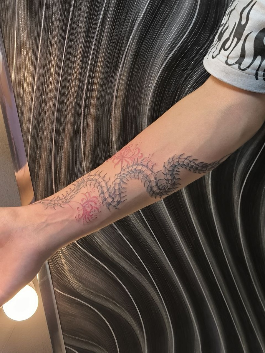 Бабушка сказала: "Бей тату!" 👵💥 Сколопендра + Ликорис Знаете, как обычно? "Мама убьет!" или "Бабушка не поймет!" 😅 А у меня — сюрприз! Первая тату моего гостя прошла с ОФИЦИАЛЬНЫМ одобрением мамы... и БАБУШКИ! Причем бабуля была главным идейным вдохновителем! 💪 Да-да, вы не ослышались, вот такие они сейчас — современные, дерзкие бабушки! 👵✨ Итак, что же украсило предплечье сегодня? 1. 🕷️ Сколопендра: Не просто жуткая многоножка! Это символ СИЛЫ, ЗАЩИТЫ и НЕУЯЗВИМОСТИ. Она выживает там, где другие сдаются. 💀 Это про стойкость, умение постоять за себя и близких. Для парня — знак, что внутри скрыта мощь, даже если с виду не скажешь. Это хищник, который не даст в обиду. 🔥 2. 🌸 Цветы Ликориса (Паучьей лилии): Те самые, что захватили мир тату! 🌋 Это не просто красиво. Ликорис — цветок с душой! Он символ страсти, преображения, но и быстротечности жизни. 💔 Красота, которая появляется ярко, но ненадолго. Напоминание ловить момент, жить на полную, ценить СЕЙЧАС. Для парня — это г