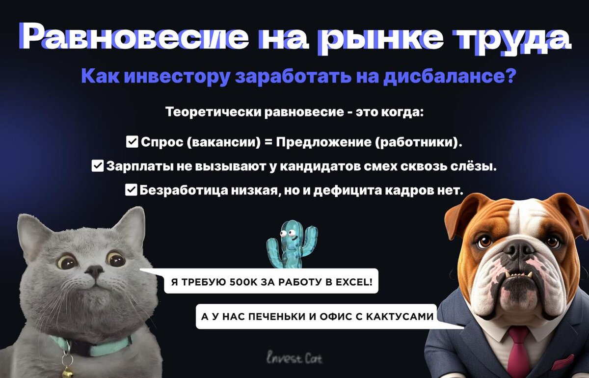 ⚖️ Равновесие на рынке труда: как инвестору заработать на дисбалансе? Рынок труда сегодня — это не просто статистика, а инвестиционный индикатор. Где компании кричат о кадровом голоде, а соискатели не могут найти работу, всегда кроются возможности для вложений. Разберём, как превратить дисбаланс в доход. Рынок труда напоминает свидания в Tinder 🤔: компании ищут идеального кандидата с 10+ годами опыта в нейросетях (хотя ChatGPT вышел всего пару лет назад), а соискатели мечтают о работе "на удалёнке с зарплатой как в Кремниевой долине, но без английского". Где же золотая середина? ❓ Что такое равновесие на рынке труда (и почему его никто не видел)? Теоретически равновесие - это когда: ✅Спрос (вакансии) = Предложение (работники). ✅Зарплаты не вызывают у кандидатов смех сквозь слёзы. ✅Безработица низкая, но и дефицита кадров нет. Но в реальности всё как в анекдоте: — "У нас кризис! Некому работать!" — "А повысить зарплату?" — "Нет, у нас кризис!" ➡️3 причины дисбаланса: 1️⃣Спрос на dig