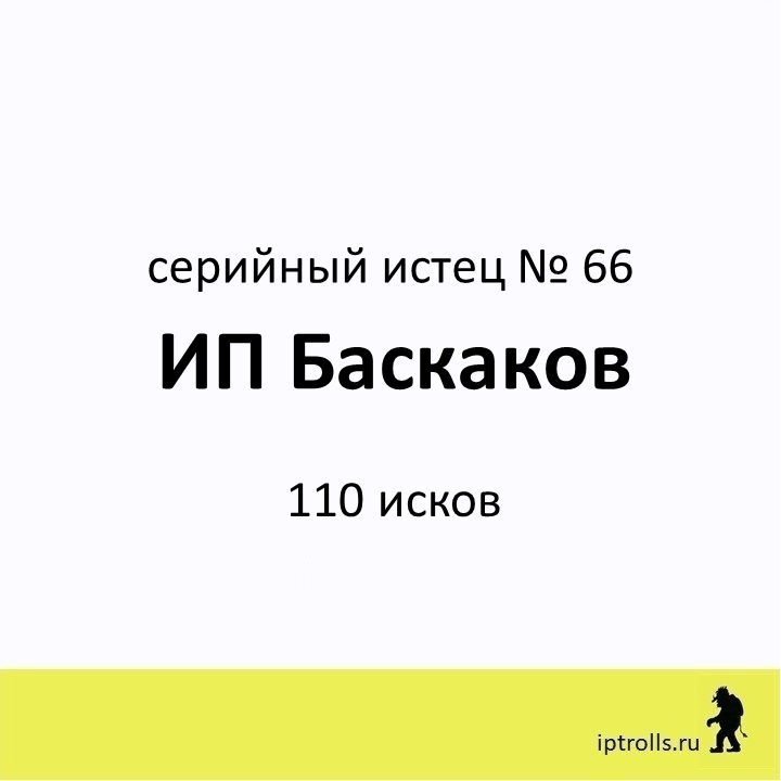 Мы собрали информацию о правообладателях, массово подающих претензии и иски в защиту авторских прав и прав на товарные знаки, а также полезные материалы и рекомендации, чтобы вы могли: Сейчас в базе более 60 серийных истцов. Вы можете проверить, не нарушаете ли вы чьи-то интеллектуальные права в рамках своего бизнеса или проекта, получить ответы на популярные вопросы и проконсультироваться. Правообладатель ИП Баскаков внесен в базу IPTrolls под № 66. Переходи в карточку правообладателя на сайте IPTrolls, чтобы узнать больше. Если вы не нашли ответ на свой вопрос, посмотрите другие материалы проекта или напишите нам через форму на сайте. _____________________ команда проекта IPTrolls 🕵🏻♂️Следите за обновлением базы