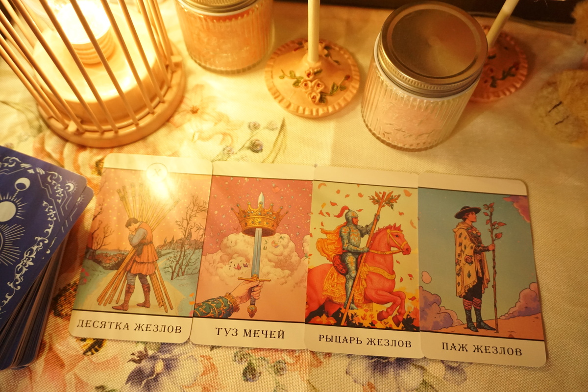 Десятка Жезлов, Туз Мечей, Рыцарь Жезлов, Паж Жезлов