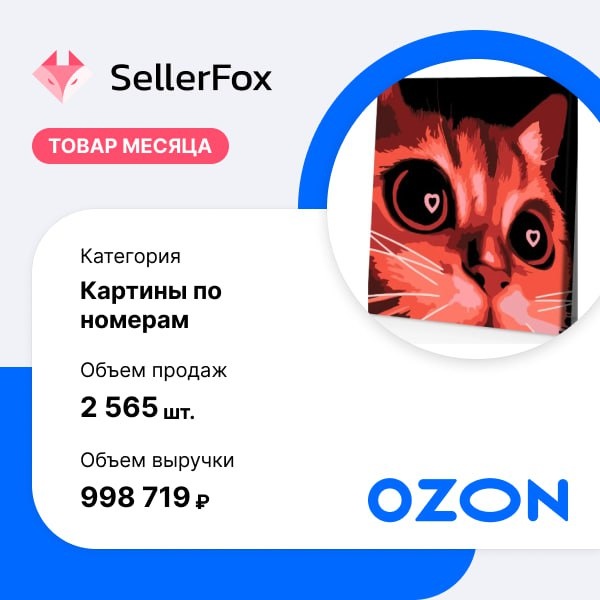Творить и зарабатывать. Кот с глазами, полными любви, стал лидером по количеству продаж в категории "Картины по номерам" на Ozon за последние 30 дней. Товар приобрели более 2,5 тысяч раз на общую сумму чуть меньше 1 млн рублей. Продавец выставил на продажу товар еще в феврале этого года. Картины по номерам - довольно перспективная ниша для продажи на российских маркетплейсах. Но здесь селлерам особенно важно найти надежного поставщика. В России уже есть крупные производители картин по номерам. К примеру, в 2023 году компания iFutureArt запустила производство картин по номерам — с нуля, на арендованной площади и с командой из десяти человек. Сегодня бизнес производит до 20 тысяч картин в месяц и работает в B2B-сегменте — продаёт товары предпринимателям с Ozon. Такой подход позволяет быстро расти, тестировать спрос и даже сотрудничать с брендами вроде «Смешариков». Как бизнес вышел на эту модель и что даёт работа через маркетплейс — рассказывает основатель iFutureArt.