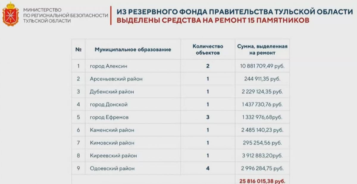 Из резервного фонда правительства Тульской области выделены средства на ремонт 15 памятников времен Великой Отечественной войны - об этом в ходе оперативного совещания губернатора сообщил замминистра по региональной безопасности Юрий Кесаонов. На два объекта в Алексине выделено 10,8 миллиона. В Арсеньевском районе реконструкция памятника обойдется в 244 тысячи 911 рублей. 2,2 миллиона будет стоить ремонт в Дубенском районе; 1,4 миллиона - в Донском. А вот модернизация сразу 3 памятников в Ефремове обойдется фонду в 1,3 миллиона. На Кимовский мемориал предполагается потратить 295 тысяч 254 рубля, на Киреевский - 3,9 миллиона. Завершают список 4 объекта в Одоевском районе (2,9 миллиона рублей). Напомним, что накануне празднований 80-летия Победы в Тульской области необходимо было проверить состояние 861 памятника.