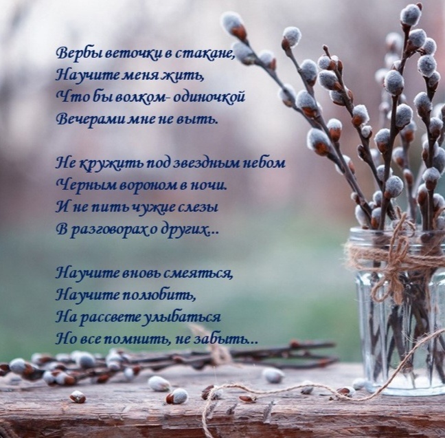 Вербы веточки в стакане, Научите меня жить, Что бы волком- одиночкой Вечерами мне не выть. Не кружить под звездным небом Черным вороном в ночи. И не пить чужие слезы В разговорах о других... Научите вновь смеяться, Научите полюбить, На рассвете улыбаться, Но все помнить, не забыть... Александр Кравченко