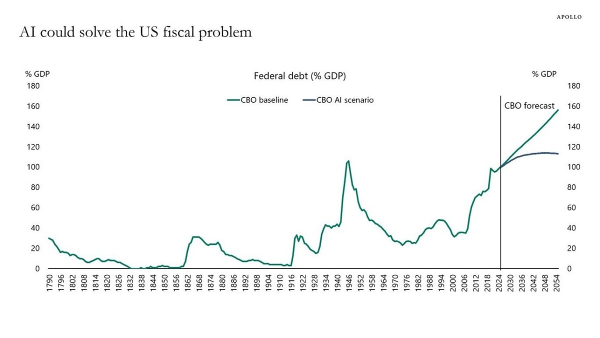 В продолжение поста коллеги @moi_misli_vslukh о рисках экспорта американской волшебной ИИ-экосистемы как инструмента зависимости союзников — действительно, создание «экспортных консорциумов» под госконтролем может привязать партнёров к США на всех уровнях, от железа до ПО. Но давайте разберёмся, зачем это США и какие есть подводные камни. ИИ обещают как панацею, включая решение бюджетной проблемы. По графику Apollo (CBO baseline vs CBO AI scenario), базовый прогноз Управление Конгресса США по бюджету долг США к ВВП — аж 180% к 2040-м, однако с ИИ [рост производительности +2% годовых] он волшебным образом стабилизируется на 120%. Звучит заманчиво — ИИ «решает» дефицит, снижая расходы и повышая доходы. Но это хайп: реальность от его внедрения — массовые проблемы. Повсеместное хакерство, кибер- и финмошенничество, неграмотность и безработица [миллионы рабочих вытеснит автоматизация], плюс рост цен на электричество. Экспорт ИИ-зависимости маскирует проблемы на уровне реальной экономики