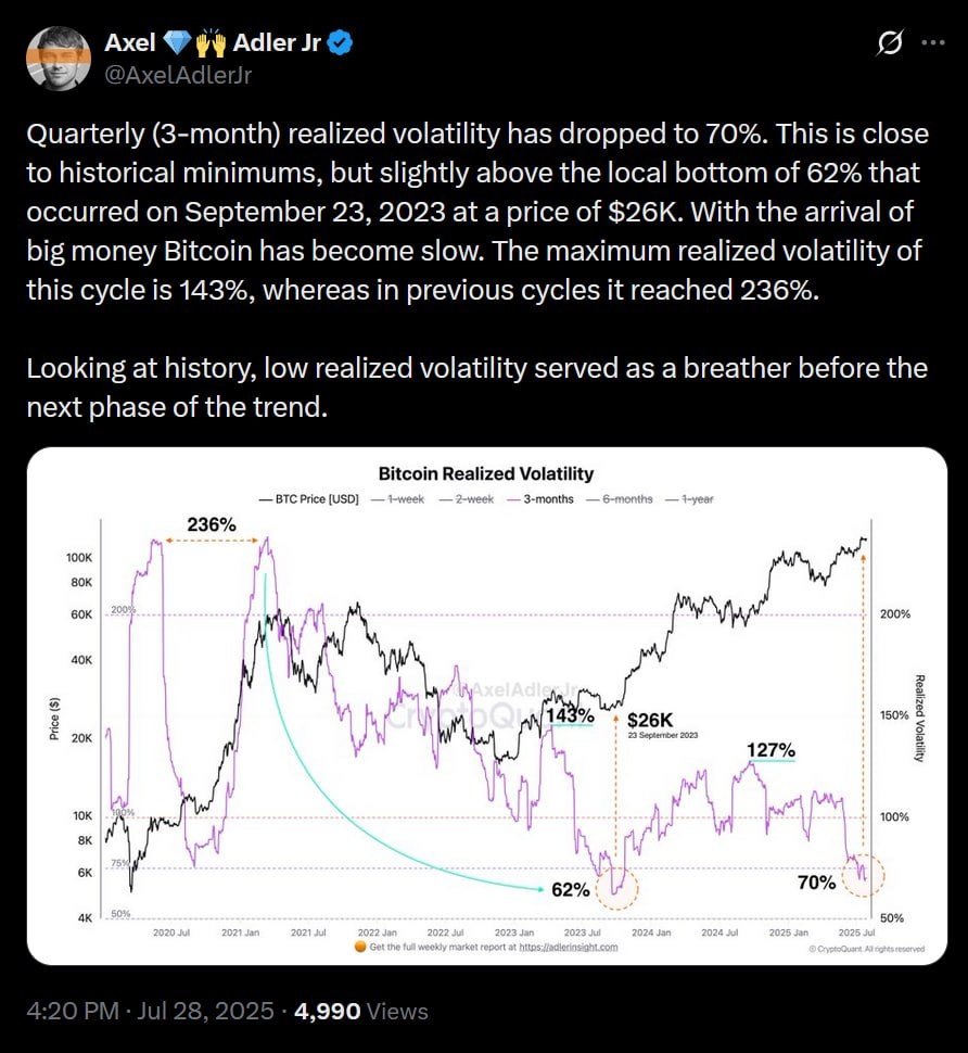 π ΠΠΎΠ»Π°ΡΠΈΠ»ΡΠ½ΠΎΡΡΡ BTC Π΄ΠΎΡΡΠΈΠ³Π»Π° ΠΌΠΈΠ½ΠΈΠΌΡΠΌΠΎΠ² π’ Π’Π΅ΠΊΡΡΠ°Ρ Π²ΠΎΠ»Π°ΡΠΈΠ»ΡΠ½ΠΎΡΡΡ BTC ΡΠΏΠ°Π»Π° Π΄ΠΎ 70% β ΡΡΠΎ Π±Π»ΠΈΠ·ΠΊΠΎ ΠΊ ΠΈΡΡΠΎΡΠΈΡΠ΅ΡΠΊΠΈΠΌ ΠΌΠΈΠ½ΠΈΠΌΡΠΌΠ°ΠΌ (Π»ΠΎΠΊΠ°Π»ΡΠ½ΡΠΉ ΠΌΠΈΠ½ΠΈΠΌΡΠΌ β 62% Π² ΡΠ΅Π½ΡΡΠ±ΡΠ΅ 2023 ΠΏΡΠΈ ΡΠ΅Π½Π΅ $26K). π’ΠΠΎ ΡΡΠ°Π²Π½Π΅Π½ΠΈΡ Ρ ΠΏΡΠΎΡΠ»ΡΠΌΠΈ ΡΠΈΠΊΠ»Π°ΠΌΠΈ, BTC ΡΡΠ°Π» ΠΌΠ΅Π½Π΅Π΅ Π²ΠΎΠ»Π°ΡΠΈΠ»ΡΠ½ΡΠΌ: ΠΌΠ°ΠΊΡΠΈΠΌΡΠΌ ΡΡΠΎΠ³ΠΎ ΡΠΈΠΊΠ»Π° β 143%, ΡΠΎΠ³Π΄Π° ΠΊΠ°ΠΊ ΡΠ°Π½Π΅Π΅ Π΄ΠΎΡ
