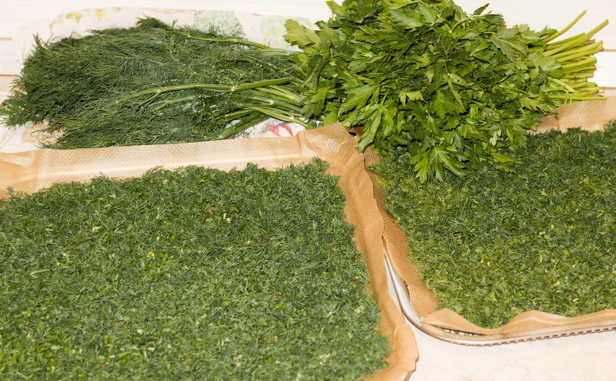 - Обсушивание: Крайне важно полностью обсушить петрушку, как и укроп.