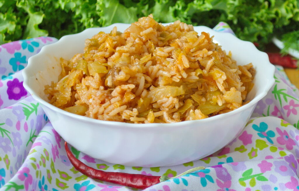 Этот рецепт для тех, кто любит быстрое приготовление пищи. ИНГРЕДИЕНТЫ: 1. Мясной фарш 500г. 2. Рис 150г. 3. Капуста 800г. 4. Морковь 1 шт. 5. Лук 2 шт. 6. Томатная паста 1 ст. л. 7. Масло растительное 100г. 8. Кипяток 500г. Обжарить нашинкованную морковь и лук. Добавить фарш и довести до полуготовности с томатной пастой. Капусту нарезать соломкой и выложить сверху, когда она осядет, то перемешать и посолить. Промытый рис распределить по сковороде и залить кипятком. Примерно через 30 минут отключить до готовности риса. Блюдо очень вкусное.
