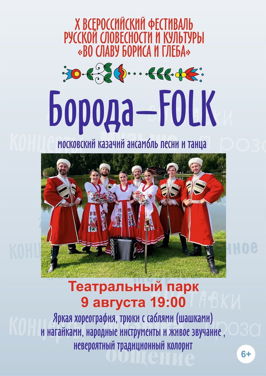 Дорогие жители и гости Борисоглебска, приглашаем вас на яркое событие в рамках X Всероссийского фестиваля русской словесности и культуры «Во славу Бориса и Глеба»! В этот вечер нас ждет потрясающий концерт Московского казачьего ансамбля песни и танца «Борода FOLK»: — яркая хореография; — захватывающие трюки с саблями и нагайками; — звучание народных инструментов; — невероятный традиционный колорит. 📅 Когда: 9 августа в 19:00 📍 Где: Театральный парк Не упустите возможность погрузиться в атмосферу настоящего казачьего искусства! 😉