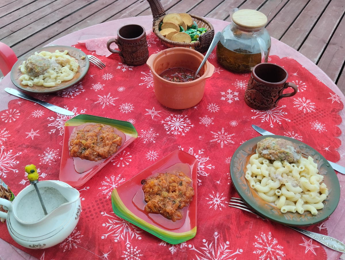 Привет, друзья! На днях ДМ приготовил на обед котлеты с макаронами. Расскажу как готовил. На две котлеты потребовалась одна четверть фарша из говядины (из "Магнита"). Лук, морковь, зелень и тертый кабачок(со своего смешного огорода). Формируются котлетки и запекаются в нашей мини электропечке в форме для запекания с небольшим количеством воды. Соль и специи по вкусу. Перед подачей сок от котлет вылить на макароны. На две порции потребовалось пол пачки макарон. Очень сюда подходит соус из томатной пасты и зелени, о котором я писала вот тут=> Ещё готовила с утра кабачковую икру, добавляла туда чесночную соль=> Чеснок прямо так стушился, что я не нашла этих листьев в готовой икре. Горчичка на любителя Жарко, чай пили зелёный. А вот так выглядела готовая икра, я рецепт уже давала тут=> Второй раз за сезон икру варю кабачковую, пока не надоело. Чего-то мы наелись так, что даже ужинать не захотели, ЛМ просто холодного зелёного чая попил, а я рюмочку йогурта своего приготовления