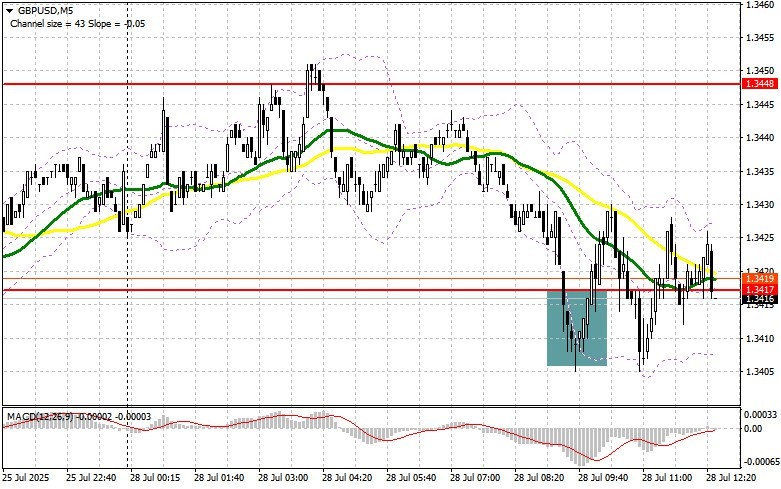 В своем утреннем прогнозе я обращал внимание на уровень 1.3416 и планировал от него принимать решения по входу в рынок. Давайте посмотрим на 5-минутный график и разберемся с тем, что там произошло. Снижение и формирование ложного пробоя в районе 1.3416 позволили получить хорошую точку входа на покупку фунта, но после роста на 15 пунктов давление на пару вернулось, а торговля переместилась в район 1.3417. На вторую половину дня техническая картина была пересмотрена.