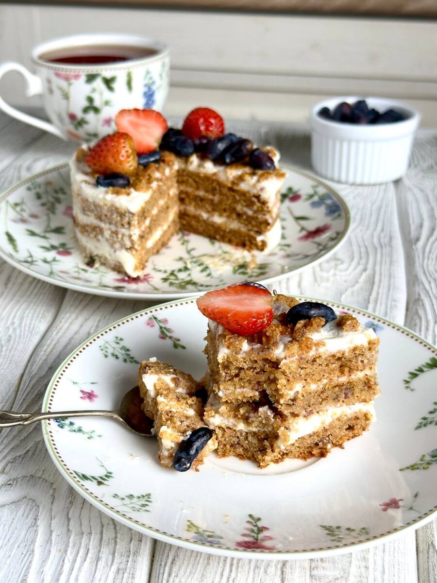 Лето - это не про стояние у плиты. Это про лёгкость, ягоды с куста, босые ноги в траве и десерты, которые готовятся за 10 минут. Сегодня хочу поделиться с вами двумя моими любимыми тортами без белого сахара - оба проверены не раз, получаются вкусными, нежными и очень быстрыми в приготовлении. Да, совсем без белого сахара - сладость здесь только из фиников и бананов. И да, оба можно сделать за считанные минуты (не считая духовки, конечно, но пока она работает, вы уже почти свободны). Этот торт я приготовила за 10 минут вечером, пока дети укладывались спать. Минимум усилий, максимум удовольствия. Финики в тесте - не просто натуральный подсластитель, они придают коржам ту самую карамельную текстуру, как будто торт томился с мёдом. Очень уютно и по-домашнему. Совет: если готовите на компанию - просто удвойте пропорции и берите кольцо 16 см. Этот рецепт родился из желания сладенького без особого повода. Просто чтобы с чашкой домашнего капучино. Бисквит - на банане. Крем - творог, йогурт, фи