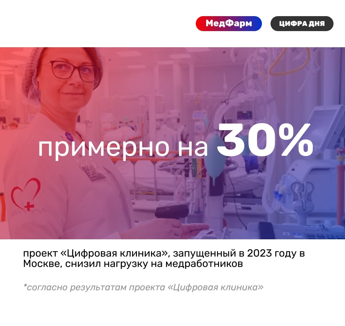 Проект «Цифровая клиника», запущенный в 2023 году в Москве, снизил нагрузку медработников примерно на 30%. Он также позволил освободить врачам и медсестрам 1,5–3 часа в смену на общение с пациентами.