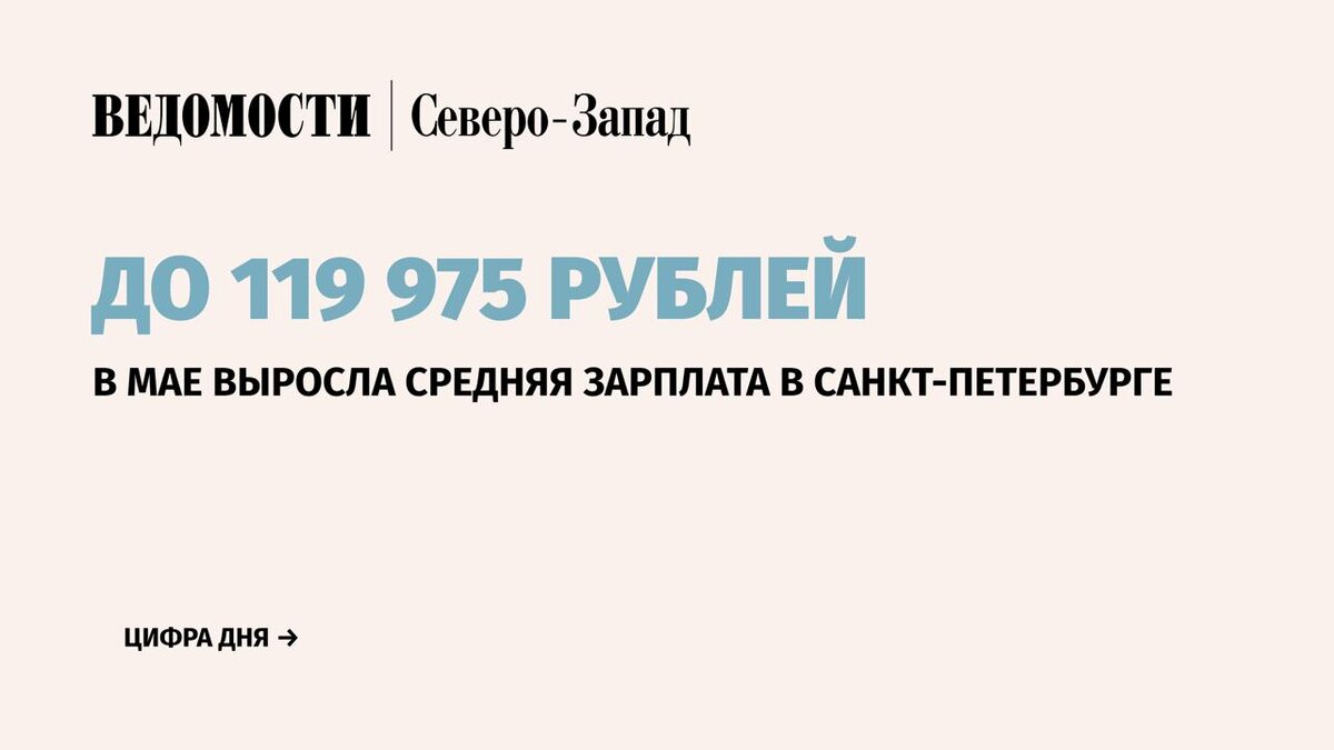 Средняя заработная плата на одного работника в Санкт-Петербурге в мае 2025 г., включая субъекты малого предпринимательства, составила 119 975 руб. Это на 14,4% выше, чем в мае 2024 г., следует из данных Петростата. ⚪️По сравнению с апрелем 2025 г. средняя зарплата на одного работника в мае выросла на 1,9%. ⚪️Наибольшая средняя заработная плата за месяц зафиксирована в сфере добычи полезных ископаемых, она составила 247 004 руб. ⚪️В число лидеров по средней зарплате, начисленной в Петербурге за май, также вошли сферы деятельности водного транспорта — 191 202 руб., воздушного и космического транспорта — 187 315 руб. 📰 Подпишитесь на «Ведомости Северо-Запад»