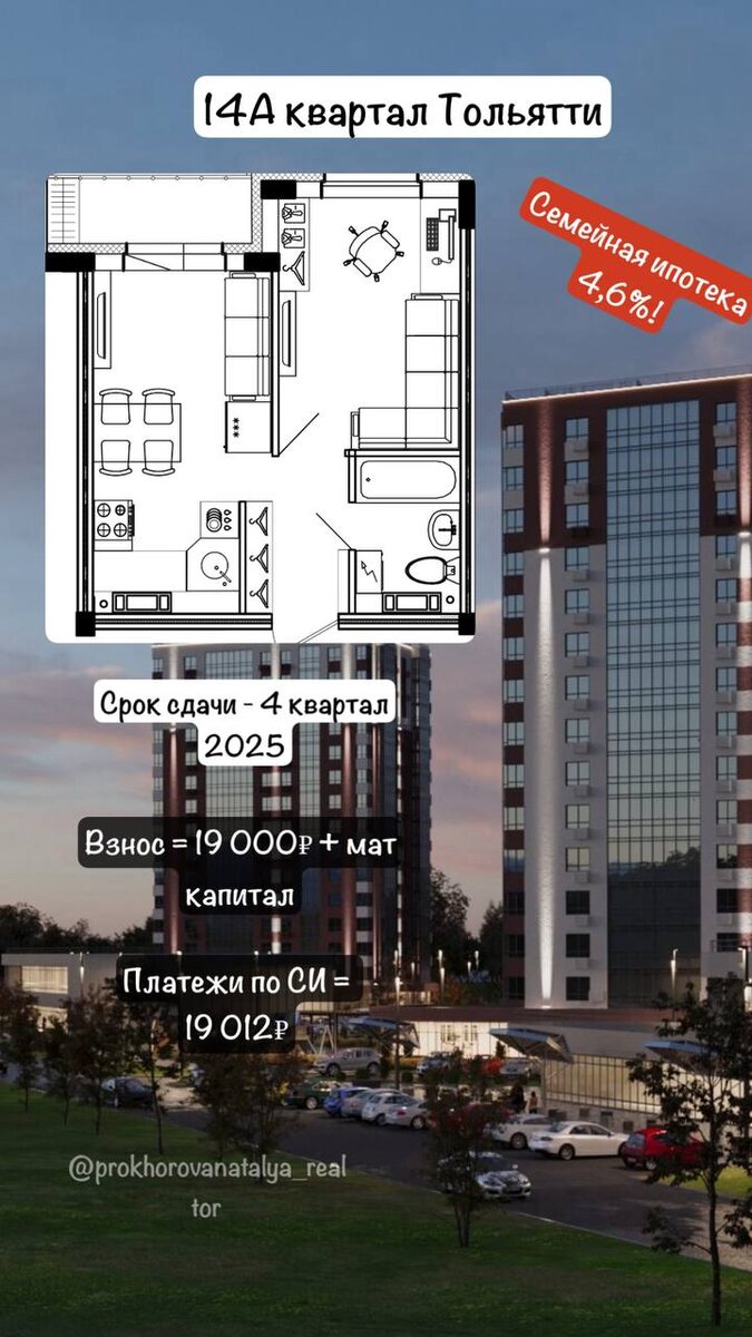 14А квартал Тольятти. Квартира у леса за 19 000₽ + мат капитал. ✅ сдача - 4 квартал этого года ✅ ставка 4,6% (семейная ипотека) ✅ первый взнос: 19000₽ + мат.капитал ✅ платеж: всего 19 012₽/мес Осталась 1 такая квартира. И еще 2 с первым взносом 77 000р + мат.капитал О ЖК: Кирпичный 15-этажный дом, архитектурная подсветка Панорамные лоджии, увеличенные окна Тренажерный зал 24/7 для жильцов Большая парковка Зоны хранения колясок/велосипедов на каждом этаже ➡️ узнайте подробности и забронируйте: 89278911791 Ссылка на канал