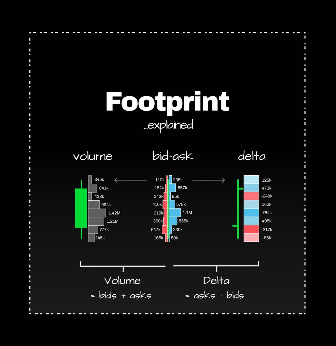 📉 Footprint Charts 101: Let's Break It Down! Ever wondered what's cooking inside those candlesticks? 🤔 Footprints reveal the real action—who's buying, who's selling, and where the drama unfolds! Here's the scoop: ➡️ They display bid vs ask volume at each price level. ➡️ Check them out as volume clusters, profiles, or deltas. ➡️ Perfect for spotting absorptions, imbalances, and those sneaky trapped traders. ➡️ They unveil the true intent behind price moves—not just what happened! Footprints show not just where the price went but how it got there! 🔍💥 #TradingInsights #MarketMoves
