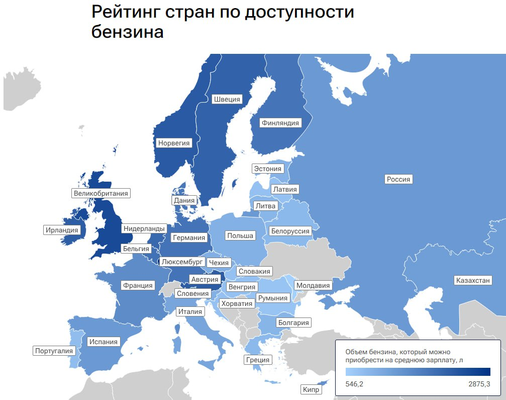 Россия заняла 15-е место в рейтинге европейских стран по доступности бензина. По данным РИА Новости, средняя зарплата позволяет россиянину купить 1360 литров АИ-95 (при цене 62,3 руб./л). Для сравнения: лидер рейтинга — Люксембург (2875 л), а аутсайдер — Молдавия (546 л). В первой пятерке также Великобритания, Норвегия, Австрия и Ирландия, где на зарплату можно приобрести более 2200 литров. ▪️Цены растут только у нас и соседей В 2025 году бензин подорожал лишь в России (+2,7%), Беларуси (+6,6%) и Казахстане, тогда как в 29 других странах цены снижались. Самый дешевый бензин — в Казахстане (40 руб./л), а самый дорогой — в Дании (179 руб./л). При этом биржевая цена АИ-95 в России приближается к рекорду — 76 330 руб./тонна. ▪️Какие прогнозы по стоимости бензина в России? Власти готовят запрет на экспорт бензина с 1 августа, а также пересмотр демпферных выплат нефтяникам. «Рост цен вопреки общему тренду обусловлен инфляционными процессами», — поясняют эксперты. 😁 Как вы считаете, в России