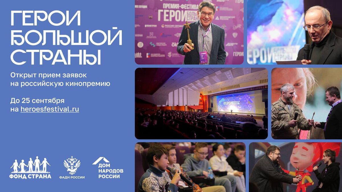 25 июля стартовал приём заявок на участие в третьей кинопремии «Герои большой страны» — важном событии в мире кино, которое пройдёт уже в третий раз 💪 ✨ Авторы и правообладатели могут подать свои проекты до 25 сентября 2025 года на сайте heroesfestival.ru. Церемония награждения состоится в феврале 2026 года в Национальном центре «Россия» в Москве. Премия будет вручаться в следующих номинациях: 📌 Герои-защитники; 📌 Герои специальной военной операции; 📌 Герои науки и технологий; 📌 Человек труда; 📌 Герои семьи; 📌 Герои воспитания; 📌 Герои — строители будущего. 🎯 Цель премии — поддержать культуру и компетенции в создании фильмов, которые имеют глубокое духовно-нравственное содержание, транслируют традиционные ценности и формируют образ героя, служащего своей семье, обществу и меняющего к лучшему свою страну. В преддверии церемонии награждения пройдёт двухдневный форум премии. Один из его блоков будет посвящён 17 традиционным ценностям России. Проект проводится при под