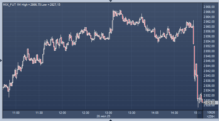 Российский рынок начал падать в субботу после снижения ставки в ответ на негативные новости геополитического характера. Сегодня ситуация ухудшилась График фьючерса на индекс Мосбиржи интервалами в 1 минуту Не успел рынок отойти от пятничной порции негативных новостей на тему санкционного прессинга, как только что Трам ппригрозил сократить срок, который он предоставил России на заключение мира/перемирия с Украиной. В понедельник президент Соединённых Штатов Америки Дональд Трамп сообщил о своём решении сократить срок в 50 дней, который он ранее отводил для достижения мирного соглашения между Российской Федерацией и Украиной. «Я сокращу срок в 50 дней, который дал, потому что я уже знаю ответ на вопрос, что произойдет», — сказал Трамп во время визита в Шотландию. При этом американский лидер выразил недовольство политикой российского руководства в отношении Украины. «Я разочарован президентом России Владимиром Путиным», — отметил президент.«Посмотрим, что будет. Я очень разочарован. (...