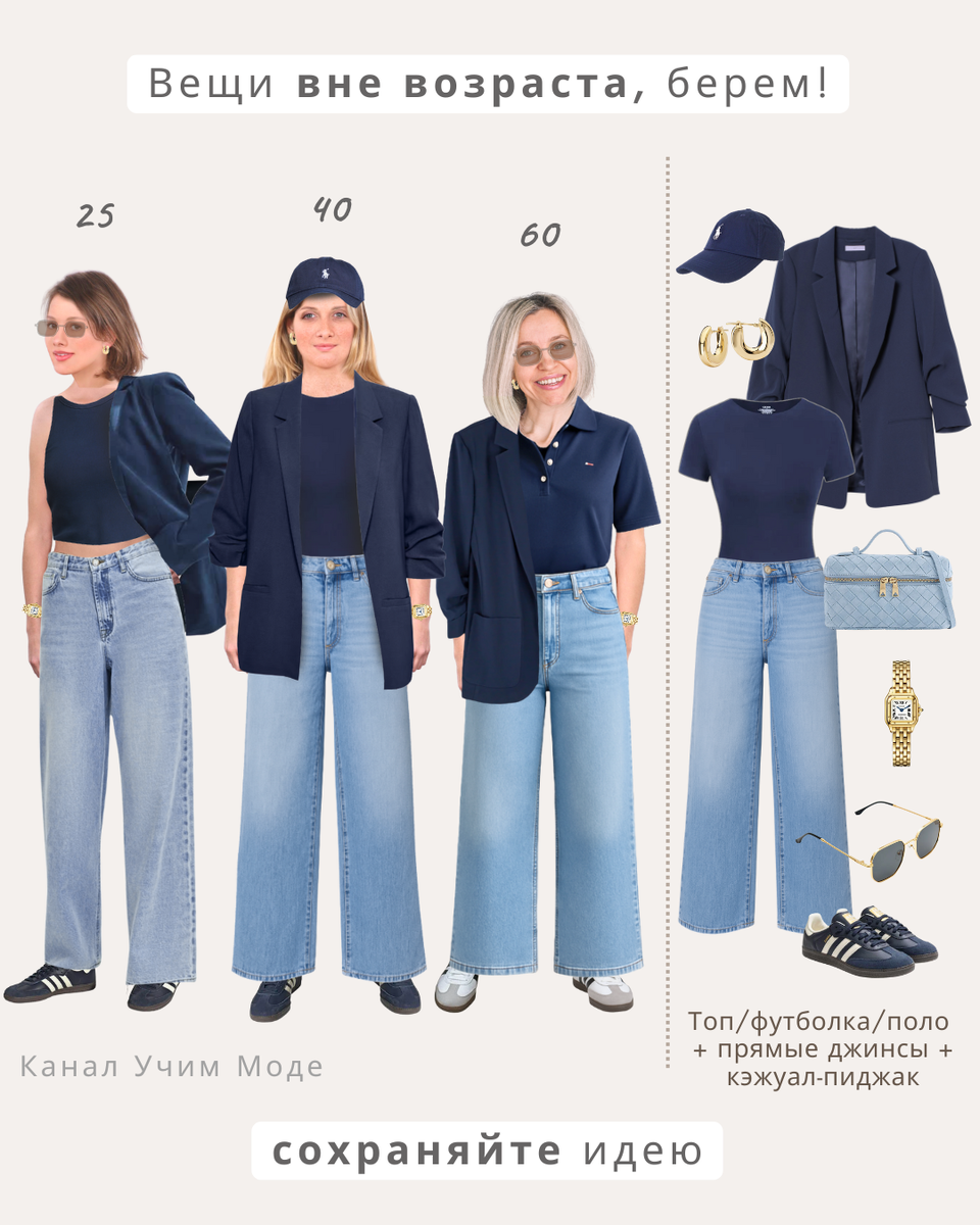 🤍 Формула 1. Топ/футболка/поло + прямые джинсы + кэжуал-пиджак.
