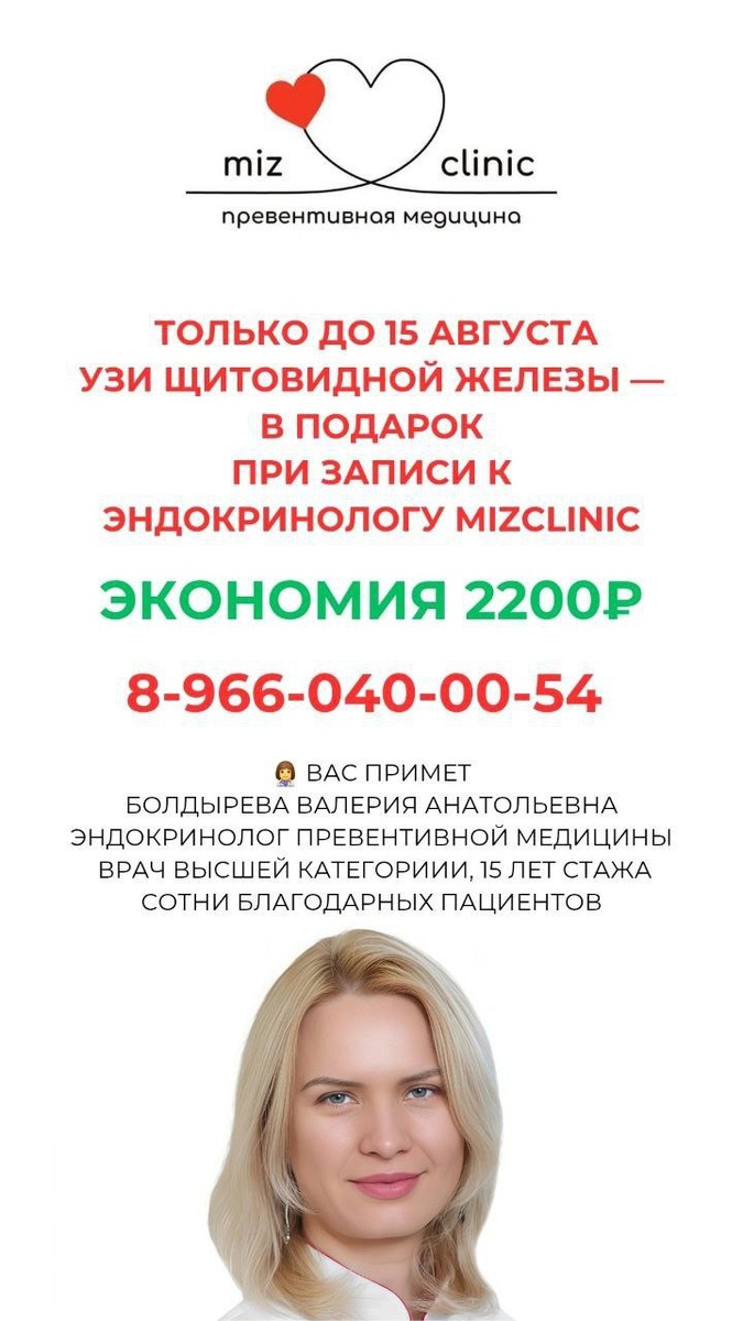 🔥 ТОЛЬКО ДО 15 АВГУСТА — УЗИ ЩИТОВИДНОЙ ЖЕЛЕЗЫ В ПОДАРОК (экономия 2200₽ при записи на приём к эндокринологу в Mizclinic) Чувствуете постоянную усталость, вес растёт «на ровном месте», а настроение скачет? Очень часто причина — щитовидная железа, гормональный «дирижёр» вашего организма. Она управляет обменом веществ, настроением, энергией и даже женским здоровьем. Если её работа нарушена, никакие диеты и спорт не помогут — вес будет возвращаться, а силы не восстанавливаться. Почему именно этот приём? Доктор Болдырева Валерия Анатольевна— эндокринолог превентивной медицины, супер-диетолог, который помогает не просто похудеть, а сделать вес стабильным и здоровье — крепким. 15 лет опыта, сотни благодарных пациентов и авторские схемы питания. Понимает не только гормоны, но и их связь с образом жизни, стрессом и питанием. Что вы получите на приёме? * Подробный разбор жалоб, анализов, рисков * Персональный план питания и нормализации веса * Рекомендации по гормональной коррекции и про