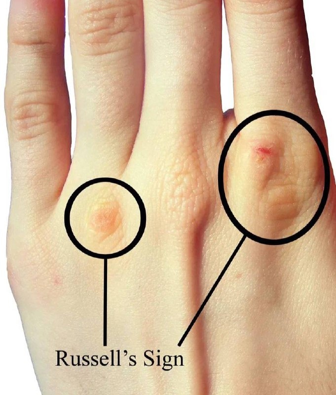 Симптом Рассела: что это и почему он важен при РПП В работе с расстройствами пищевого поведения важно обращать внимание не только на психологические, но и на телесные признаки. Один из таких маркеров — симптом Рассела, часто незаметный для пациента, но говорящий о многом врачу. 💬 Что такое симптом Рассела? Это повреждение кожи на тыльной стороне кистей и пальцев, возникающее из-за регулярной стимуляции рвоты с помощью собственных рук. Поверхность руки при этом контактирует с зубами и нёбом, что со временем приводит к: ✅ мозолям, ✅ ссадинам, ✅ микротравмам, ✅ утолщению или огрубению кожи. Обычно это зона средних фаланг указательного или среднего пальца, иногда — обеих рук. 📍Когда он появляется? Симптом Рассела наиболее часто встречается при: ➡️нервной булимии, ➡️анорексии с очищающим поведением (подтип с рвотой), ➡️в редких случаях — при смешанных формах РПП с эпизодами самопровоцируемой рвоты. Важно понимать: его отсутствие не исключает наличие булимии. Многие пациенты исп