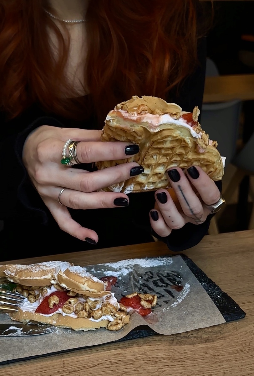 Я люблю завтракать, обедать и вообще радоваться жизни вне дома — и вот теперь у меня есть новое вафельное пристрастие. Называется это место «Vaffel», и да, здесь норвежские вафли, но не те, что тонкие и с вареньем (хотя и такие найдутся). Тут всё куда серьёзнее. Главная фишка — это вафли из пяти видов теста: классического, шпинатного, томатного, картофельного и сырного. Причём в них заворачивают буквально всё — от салата Цезарь до котлеты с беконом. ⠀ Я взяла сырную вафлю с барбекю-котлетой из говядины, жареным беконом, сыром, айсбергом, маринованными огурцами, луком и двумя соусами — барбекю и аджика. Настоящая бургер-вафля за 650 рублей — сытная, сочная и при этом как будто легче, чем классический бургер. ⠀ А потом я не смогла удержаться и взяла сладкую вафлю с прекрасным названием «Джокер» — с ягодами, мармеладными мишками, воздушной пшеницей и шапкой сливок ( 420 рублей). Хорошо! Меню тут огромное: Вафли в двух размерах Салаты, пасты, супы (даже борщ есть, да) Завтраки, которые,
