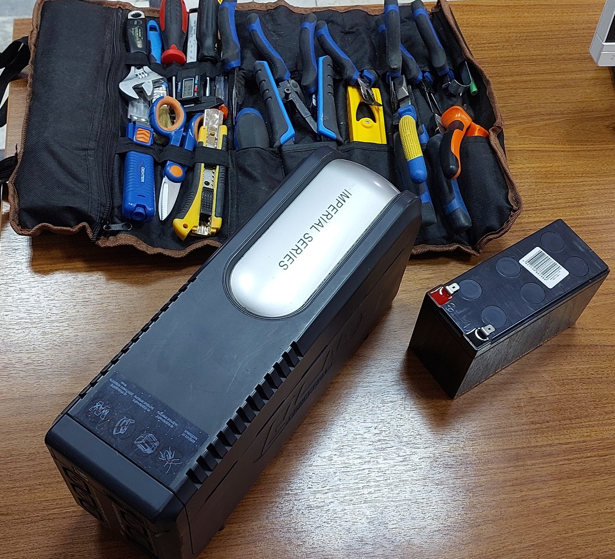Достали с склада ещё один старенький, но подлежащий восстановлению ИБП PowerCom IDM-825AP. ИБП подключили для проверки в силовую сеть с нагрузкой, но без АКБ - работает исправно! Открутили 2 винта на корпусе, сняли крышку, достали старую АКБ и подключили новую АКБ CSB HR 1234W F2 (12V, 9Ah). На ОЗОНе, такая АКБ стоит порядка 3.018₽ (https://ozon.ru/t/rjq2TLi), думаю для восстановления актуального ИБП, совсем НЕДОРОГО!
