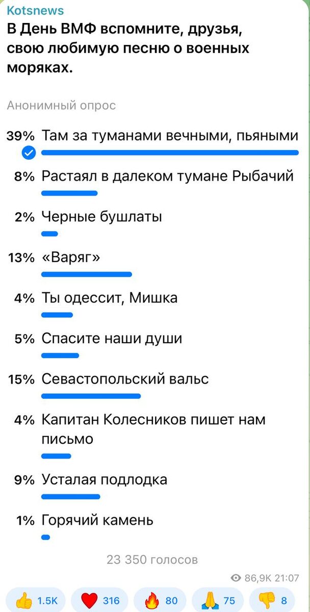 ⚡️⚡️⚡️ 39 процентов подписчиков считают лучшей песней про военных моряков бессмертную «Там за туманами» от Любе
