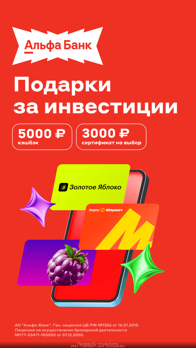 Как получить кэшбэк и сертификат на маркетплейсы с Альфа-Инвестициями 🔥 💳 Инструкция для получения сертификата 1️⃣ Перейдите по ссылке: 2️⃣ Примените промокод MONEY227, выберите один из предложенных сертификатов и оставьте КОРРЕКТНЫЙ номер телефона 3️⃣ Перейдите на сайт Альфа-Инвестиции после обязательной регистрации и откройте первый счёт для инвестиций с тем же номером телефона 4️⃣ Купите ценные бумаги на сумму от 1000₽ в течение 30 дней с момента открытия брокерского счёта ‼️ Сертификат на 3000₽ на Wildberries, Золотое Яблоко или Яндекс Маркет придёт в смс на указанный номер телефона в течение 60 дней после покупки ценных бумаг. 💸 Инструкция для получения кэшбэка до 5000₽ 🔸 Покупайте ценные бумаги на сумму от 1000₽ 10 месяцев подряд, начиная с месяца открытия счёта, и получайте кэшбэк 500₽ каждый месяц! Максимально можно получить 5000₽ ‼️ Обязательно месяц открытия счёта и месяц первой сделки (или сделок) на сумму от 1000₽ должны совпадать! Акция доступна для пользов