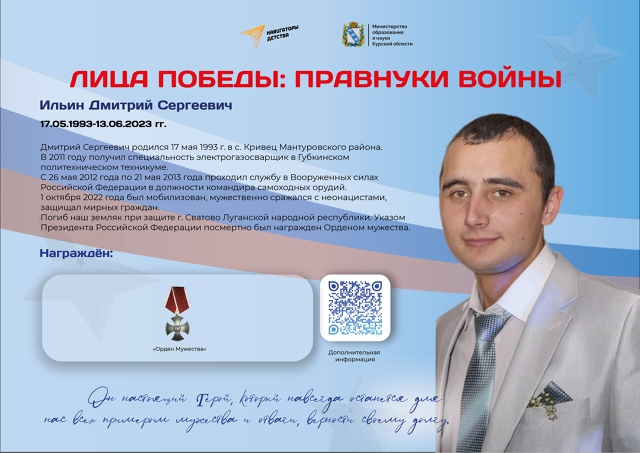 Продолжаем рассказывать об участниках специальной военной операции в рамках виртуального музея, приуроченного к 80-летию со Дня Победы в Великой Отечественной войне. Напомним, что карточки рассказывают о героях Великой Отечественной войны и специальной военной операции. Цель рубрики - сохранение исторической памяти, воспитание уважения к подвигу наших предков, формирование гражданской позиции и чувства сопричастности к истории своей страны и родного края. 🎖Рассказываем об участнике специальной военной операции Дмитрии Ильине.