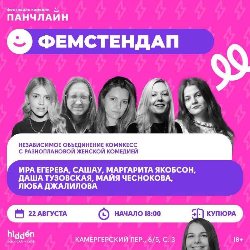 Всем привет! Скоро стартует фестиваль комедии «панчлайн», в котором я буду принимать непосредственное участие! Предлагаю договориться: я спамлю афишами и ссылками - вы регистрируетесь и приходите на концерты🤝 Первый в нашем списке концерт Фемстендапа, Риту забыли добавить на афишу, поэтому я добавила её самостоятельно и очень с этого веселюсь😁 Когда: 22 августа Во сколько: 18:00 Где: Hidden bar Камергерский пер. 6/5, стр 3 Сколько стоит: на сколько насмеяли - столько и стоит Ссылка на регистрацию: https://punchlinefest.timepad.ru/event/3467497/