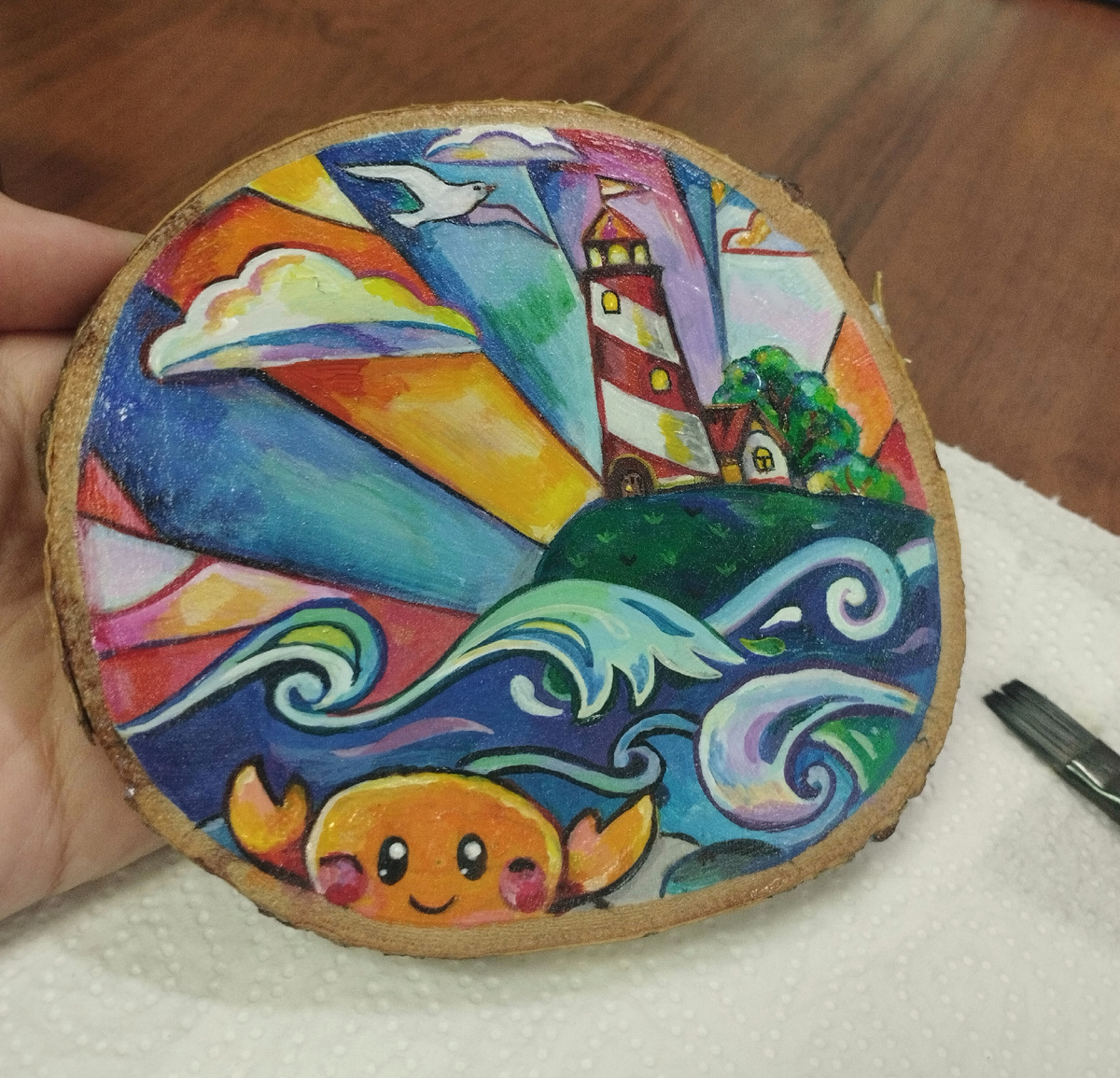 Всем приятного вечера, друзья! Самое время сейчас отдохнуть любуясь чем-то хорошим. Покажу вам снова свои работы - ведь герои на них яркие и добрые, почему бы и не вспомнить про них :) ❤️ Они же заслуживают отдельных фотографий, а ещё они могут подзарядить своей энергией перед новым рабочим днём 👍✨ Вот милый крабик - маленький обитатель морей возле маяка. Рыжий и круглый как солнышко. Крабик рад вас видеть и шлёт свой клешневой приветик 🦀 А здесь целая коллекция картин примостилась - много ярких героев и забавных образов. Такие вот искорки вдохновения и везде разное ☺️ Это мой спил с бабочкой-колибри, здесь даже саму фактуру дерева удалось сохранить. Можно посчитать, сколько этой сосенке лет 🌳 Ну а здесь зимние котики вместе со своим Манэки другом. Везде жара, а у котиков снежный холод. Даже крабик позирует на снегу 😅🦀 Ух, я прямо таки чувствую, как от этих картин струится зимняя прохлада Вот такие вот образы под завершение дня. Небольшой повод, чтобы улыбнуться ❤️ Желаю всем