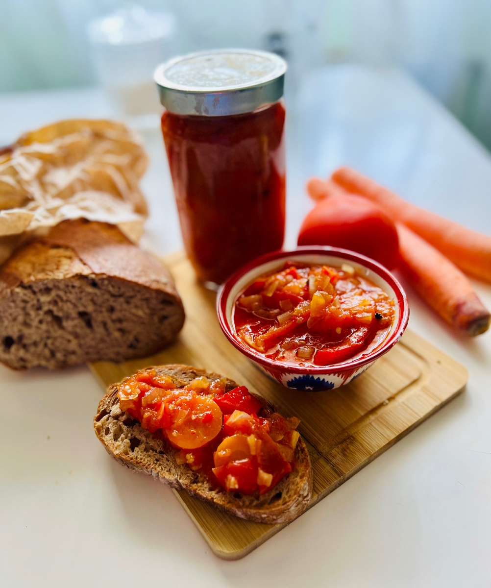 Я готовлю его, как научили меня на сербском рынке. Он напоминает и лечо, и аджику, но со своим вкусом: густой, чуть острый, с пряностями и сладким перцем