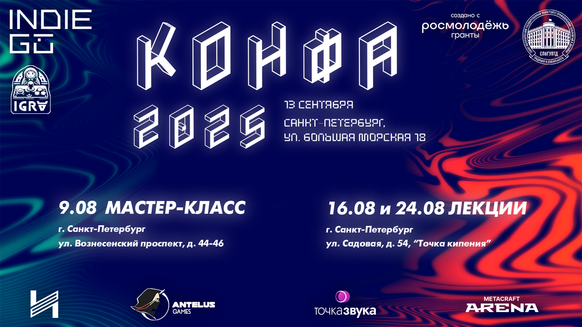 В Санкт-Петербургском государственном университете промышленных технологий и дизайна пройдет Всероссийская конференция гейм-разработчиков «Конфа». В фестивале примут участие игровые разработчики, геймеры и стримеры. Посетителей ждут презентации независимых видеоигр, двадцать стендов с авторскими проектами, конкурс косплея, демонстрация технологии motion-capture, ретро-игры, квесты и конкурсы. Мероприятие состоится 13 сентября 2025 года в концертном зале СПбГУПТД на Большой Морской, 18. Вход бесплатный, но нужна регистрация и паспорт для входа. Также в рамках мероприятия 9 августа состоится серия бесплатных практических мастер-классов в лаборатории СмартДизайн СПбГУПТД на Вознесенском проспекте, 44–46, а 16 и 24 августа пройдут бесплатные лекции для большего погружения в мир игр и стриминга. Они будут проходить в «Точке кипения - ПромТехДизайн» на Садовой, 54. Организатором выступает СПбГУПТД совместно с творческой группой IGRA. Проект реализуется при грантовой поддержке Росмолодёжи. Г