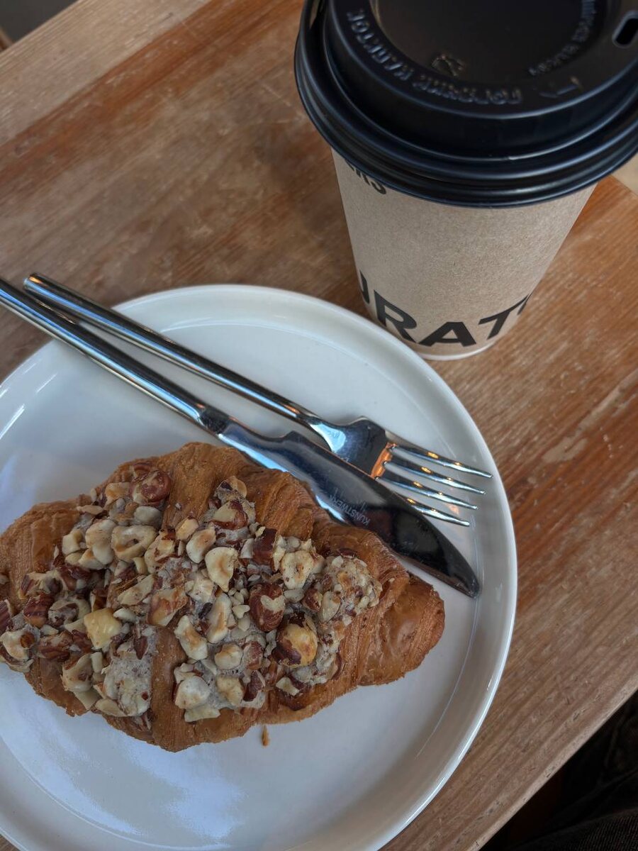 Если все эти три года искали и не нашли замену Starbucks, то это повод наведаться в Skuratov. Самое то для любителей кофе с ощутимым добавлением чуть ли не бабушкиного молока из деревни. Фанаты рафа получат удовольствие и от латте. Не отношу себя к кофейному эстету, но разница практически неуловима, потому что молочная основа выигрывает в неравной борьбе с кофе. Но вкус напитков это не портит. От себя советую фундучный круассан. Каждый орешек будто подбирали вручную. Латте халва тоже хороша для любителей послаще. Про интерьер кофейни писать ничего не будем, потому что лофтовый мир победил другие стили. Но за места часто придется сражаться в неравном бою с фрилансерами.
