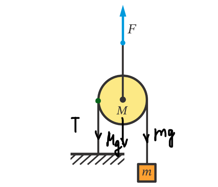 Какую силу F нужно прикладывать к оси блока в системе, указанной на рисунке, чтобы равномерно поднимать груз? Масса груза m=100 г, масса блока M=40 г. Трением в оси блока пренебрегите. Нити идеальные. Ответ дайте в Н, округлив до десятых. Ускорение свободного падения g=10 Н/кг. T=mg F=2mg+Mg Ответ 2.4 Какую силу F нужно прикладывать к левому концу верхней нити в системе, указанной на рисунке, чтобы равномерно поднимать груз? Масса груза M=2 кг, массы блоков одинаковы и равны m=600 г. Трением в оси блока пренебрегите. Нити идеальные. Ответ дайте в Н, округлив до десятых. Ускорение свободного падения g=10 Н/кг. 2T=(M+m)g = 13Н 2F=T+mg F= (13+6)/2=9.5 Ответ 9.5 Остальные задачи раздела