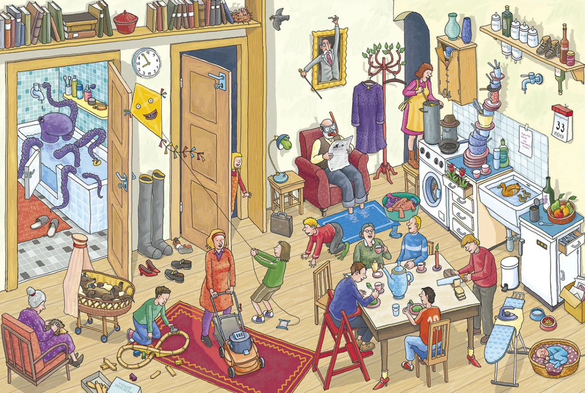 Друзья, привет! Перед Вами картинка - вроде бы обычная квартира, каждый занимается своим делом, но если присмотреться - тут много чего странного, а некоторые предметы не на своих местах.